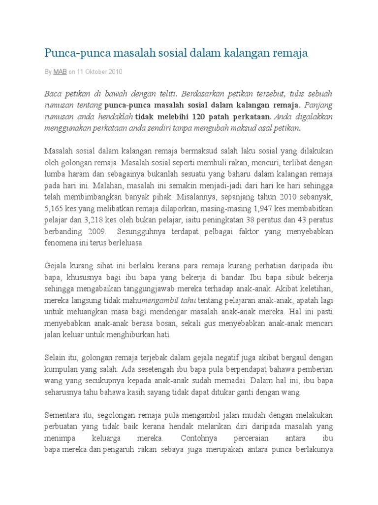 Contoh Karangan Spm Punca Punca Masalah Sosial Dalam Kalangan Remaja Dalam Meranduk Gelombang Studocu